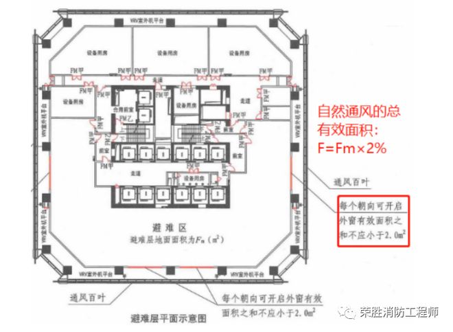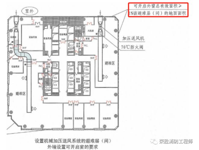 3、避难层防烟这里我们首先要明确的一点是避难层对于自然防烟还是机械防烟的选择跟高度没有关系,避难层的防烟系统可根据建筑构造、设备布置等因素选择自然通风系统或机械加压送风系统。也就是避难层是可以设自然防烟的,千万不要跟楼梯间设防烟系统的要求混淆。采用自然通风方式的避难层(间)应设有不同朝向的可开启外窗,其有效面积不应小于该避难层(间)地面面积的2%,且每个朝向的面积不应小于2.0㎡。设置机械加压送风系统的避难层(间),尚应在外墙设置可开启外窗,其有效面积不应小于该避难层(间)地面面积的1%。