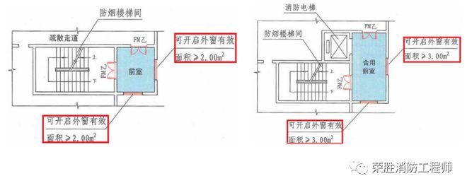 (3)梯无防,前室强。此时要求其前室的开窗应设有两个及以上不同朝向的可开启外窗,且独立前室两个外窗面积分别不小于2.0m2,合用前室两个外窗面积分别不小于3.0m2。